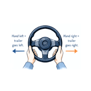 Placing hand at the bottom of the wheel. Turn left- trailer goes left. Turn right- trailer goes right.