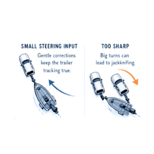 Small, calculated turns help keep you on track. Big turns can lead to jacknifing the trailer.